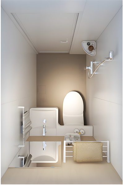 Integre el sistema de ducha, inodoro, lavabo y drenaje en uno para reducir las juntas y eliminar fugas.